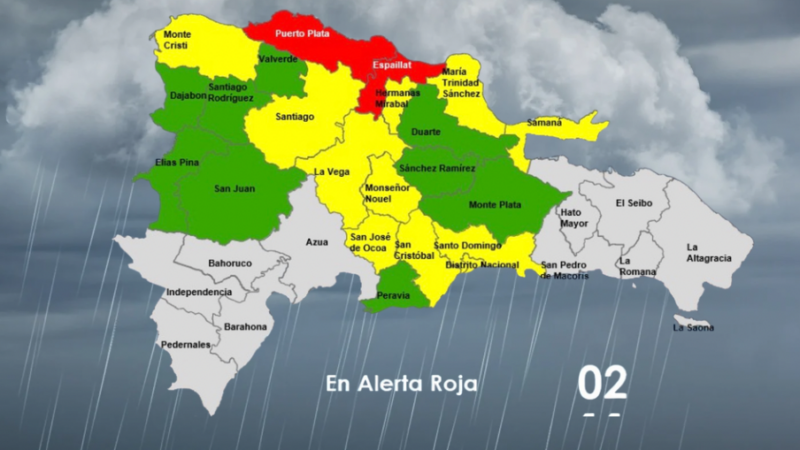 La Centro de Operaciones de Emergencias informó que las provincias de Puerto Plata y Espaillat continúan en alerta roja debido a las lluvias generadas por un sistema frontal casi estacionario, mientras otras demarcaciones permanecen en niveles de alerta amarilla y verde.